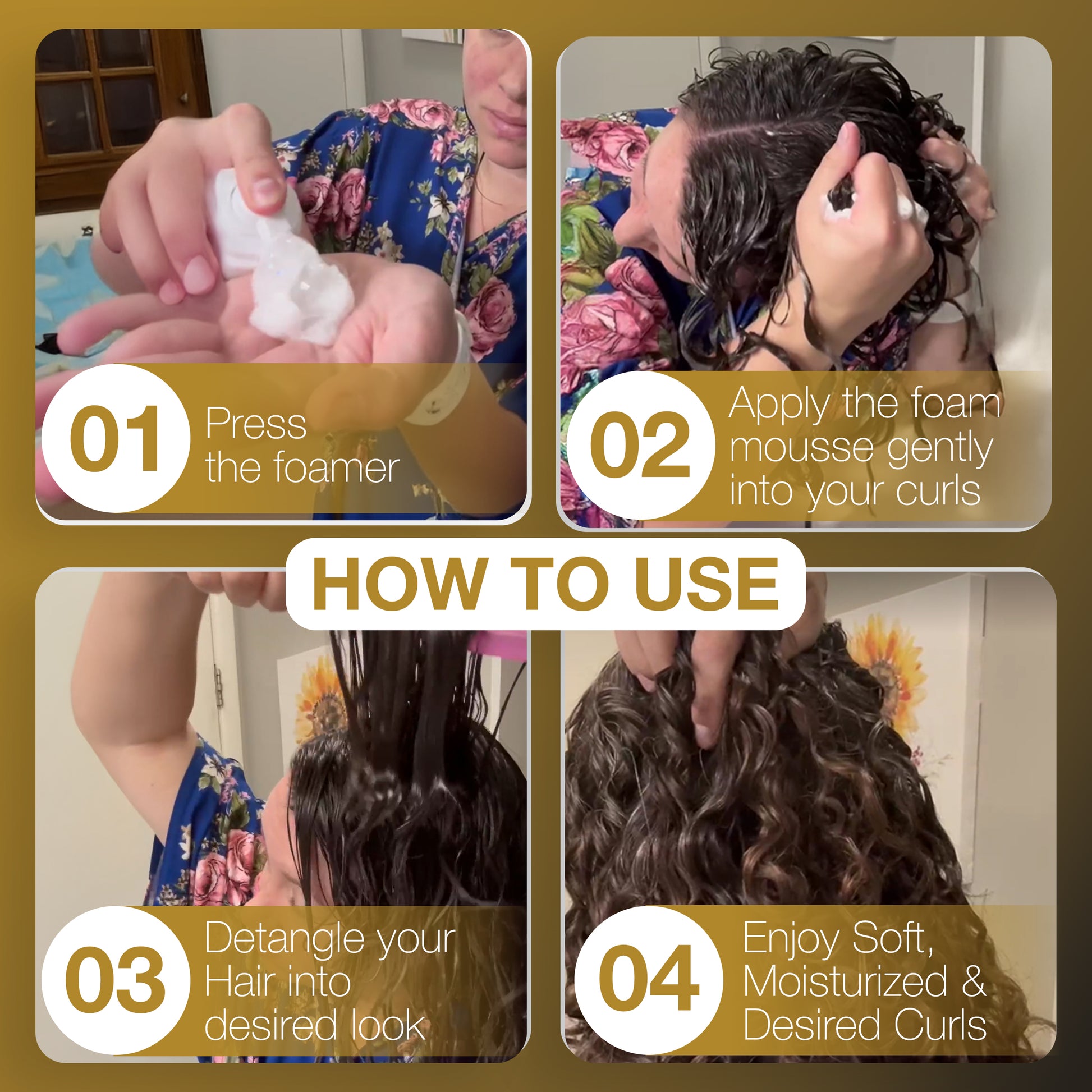 - The foam works to eliminate frizz, moisturizes and defines curls.